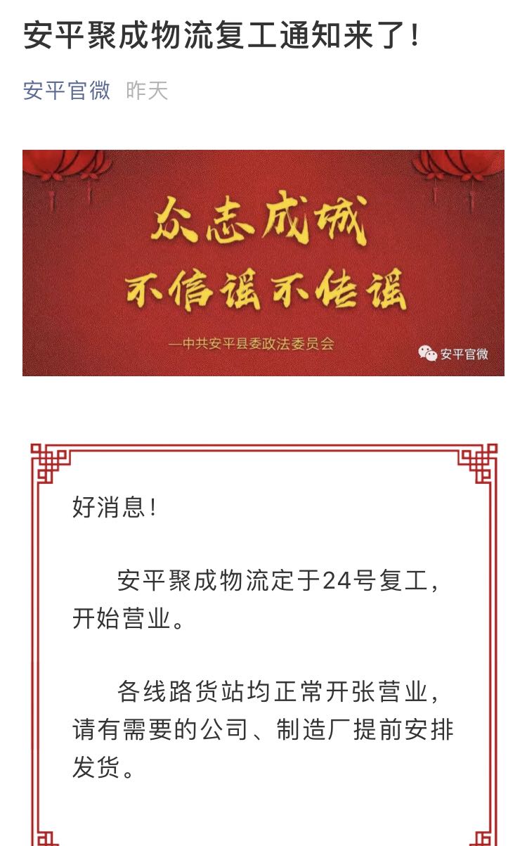 安平聚成物流復工通知來了,鋼纖維24日可正常發(fā)貨了!