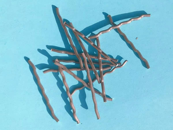 波紋鋼纖維又稱(chēng)壓痕型鋼纖維是由高強(qiáng)度冷拉鋼絲壓型切斷而成。